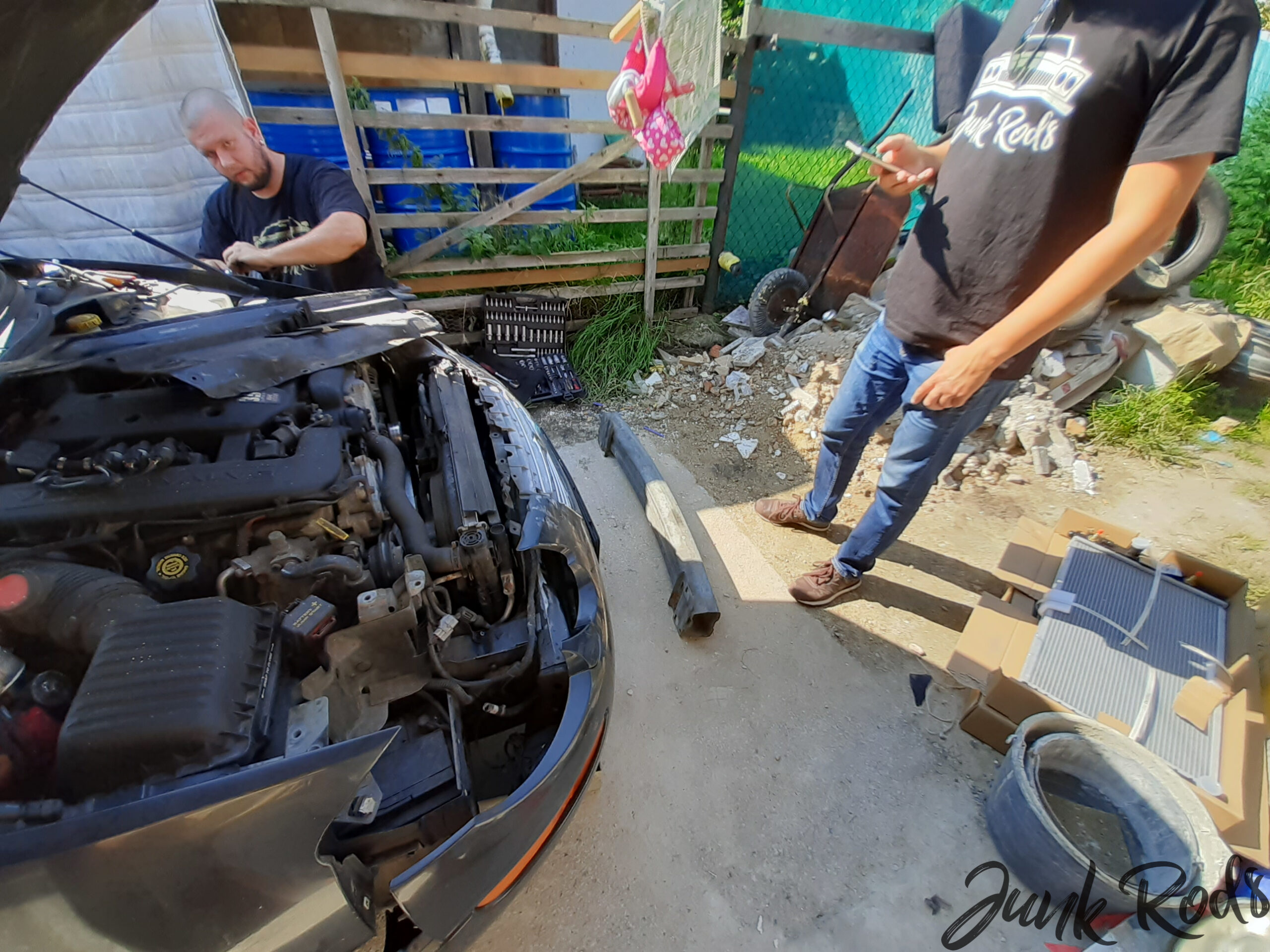 Postup je jasný – demontovat příčku nad chladičem, rozpojit hadice, vytáhnout větráky… Tady se zastavme. Chvilku pozornosti si zaslouží trubky motorového oleje a holendry na jejich koncích, které za žádnou cenu nechtěly povolit ze závitu na výměníku aniž bychom protočili trubky. Co teď? V mezičase dorazil i Gustaw, a tak s Viktorem sedli do auta a vydali se znova do Kelly, dokud bylo otevřeno, pro pertlovací sadu. Nějaké trubky tu mám, poradíme si, přinejhorším se uzavře okruh oleje bez chladiče.