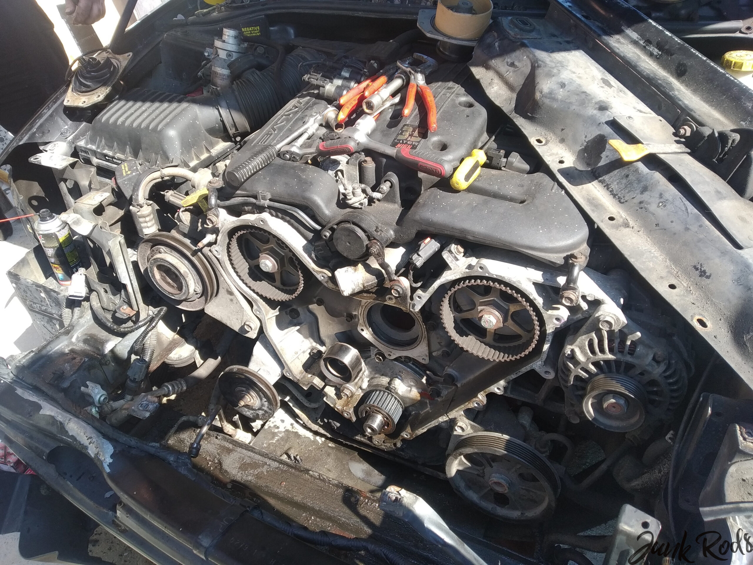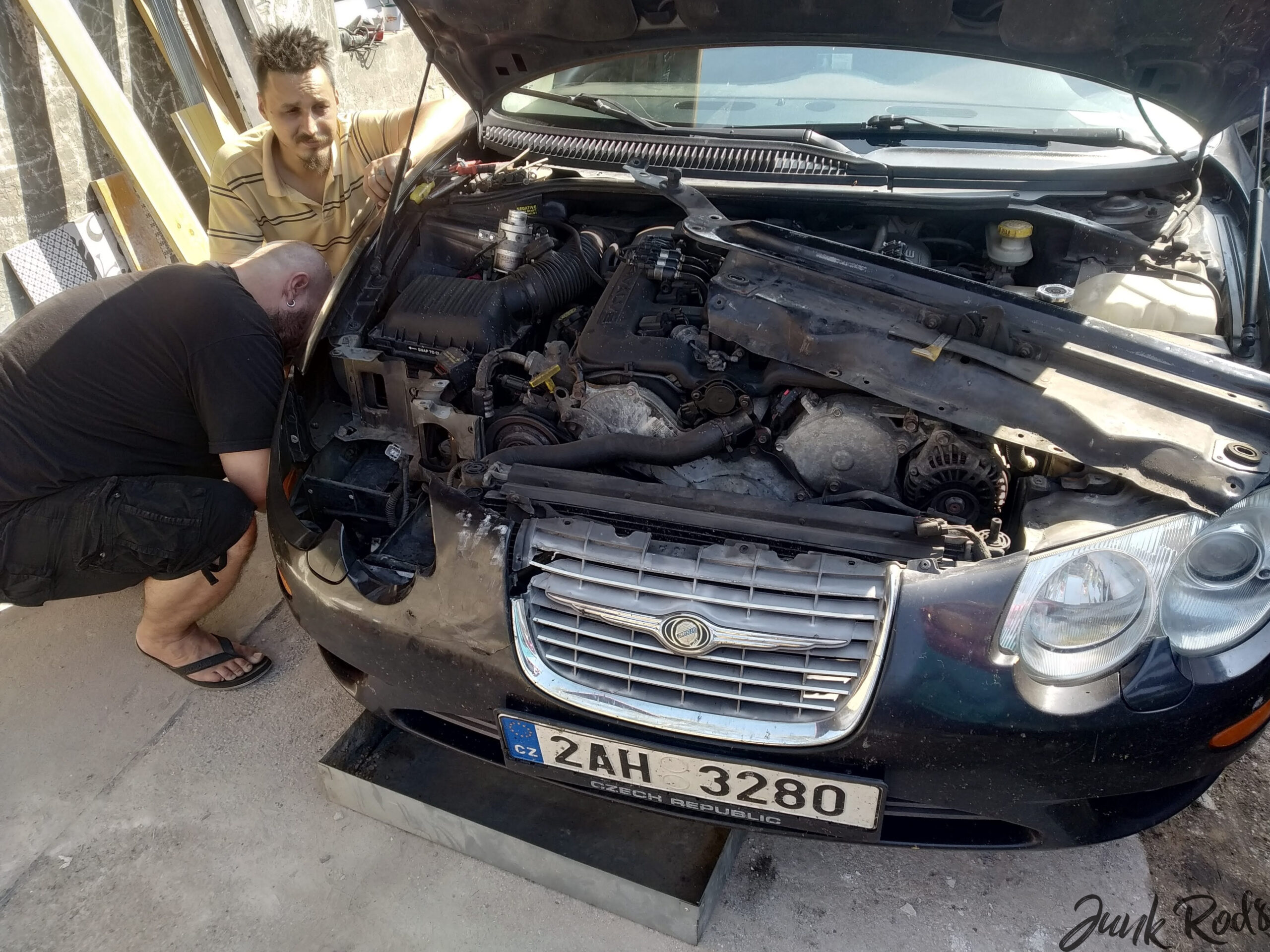 S ohledem na počasí – mimochodem, máme krásný začátek září – konečně padla volba na první sobotu devátého měsíce. Viktor přijel hned ráno a první věc, kterou jsme museli vyřešit, byl stahovák na řemenici. Měli jsme štěstí – Auto Kelly, které je nejblíže, má otevřeno i v sobotu a stahovák dodalo. Je sice velký, vhodný na náboje kol, ale s ohledem na to, že se v každém případě bude rozebírat předek auta, práci určitě zvládne. A do budoucna se hodí. 🙂 Po návratu jsem přeparkoval auta, najel s Viktorovým 300M do dvora – a jdeme na to.