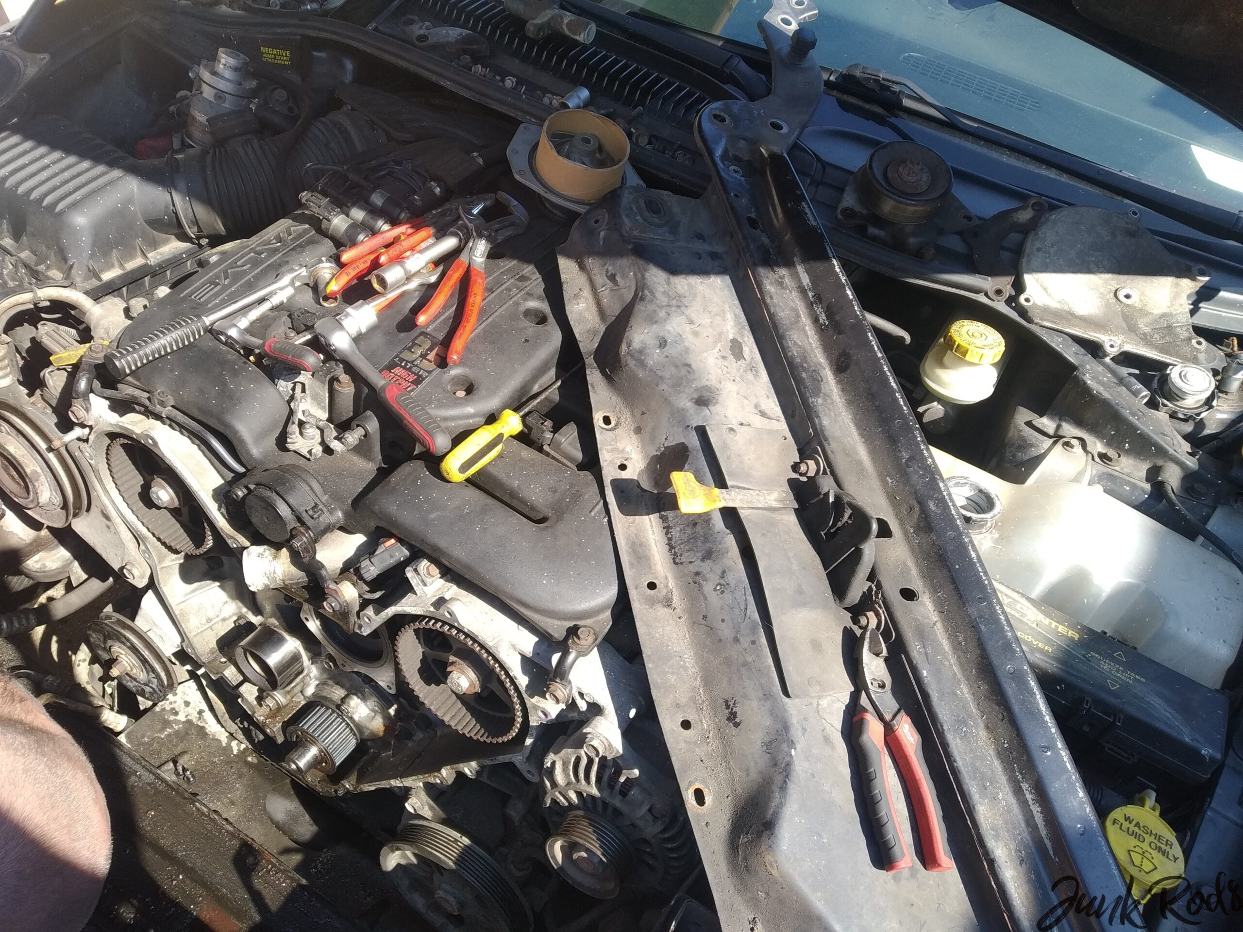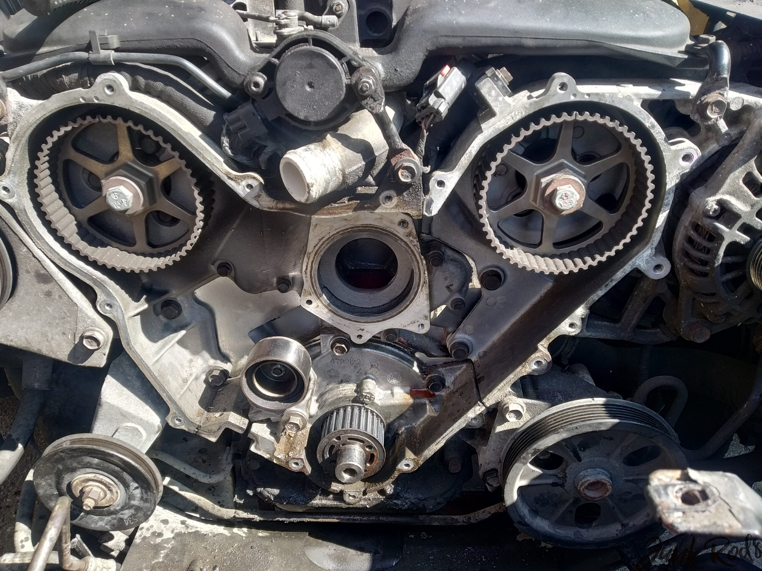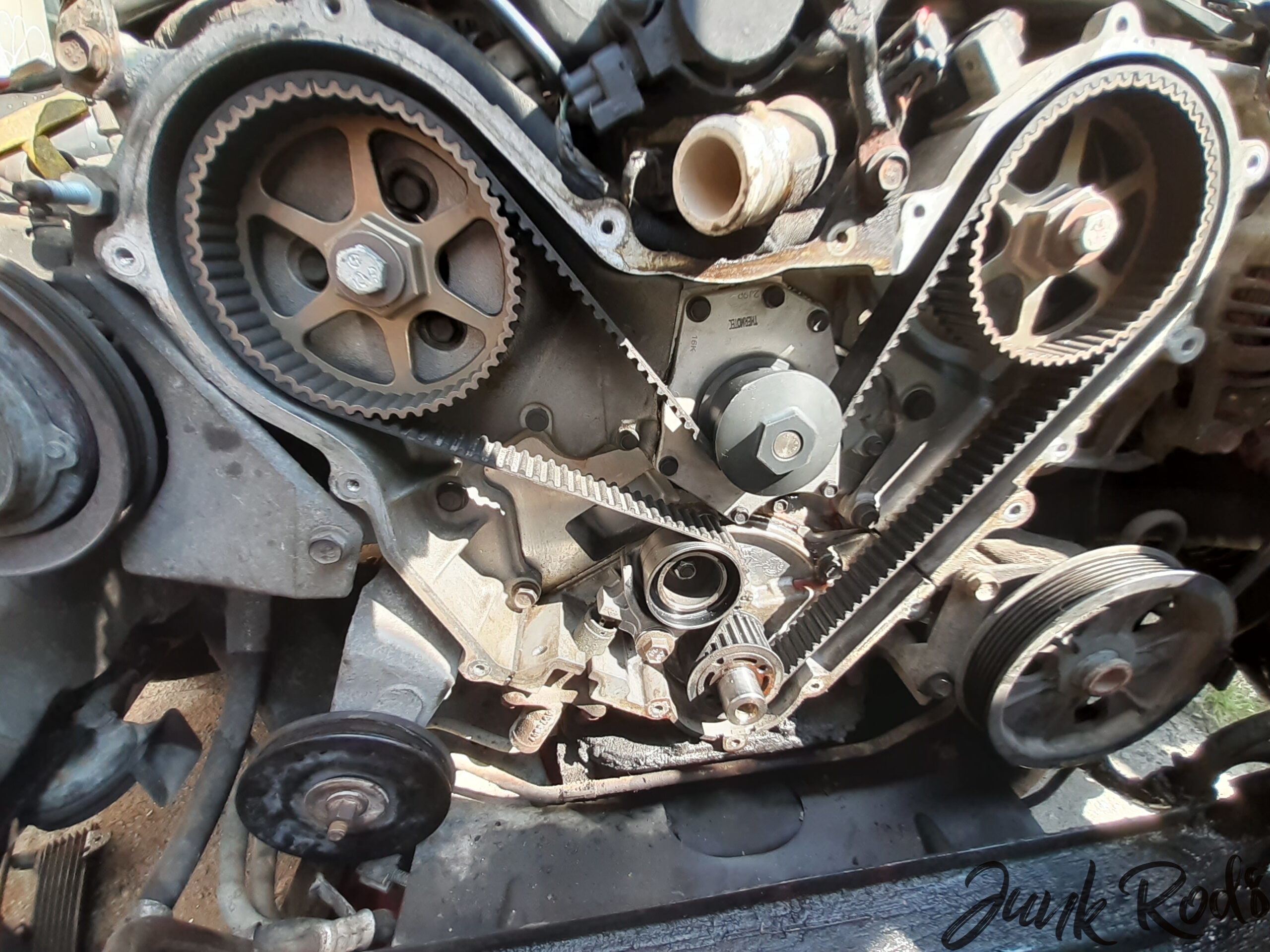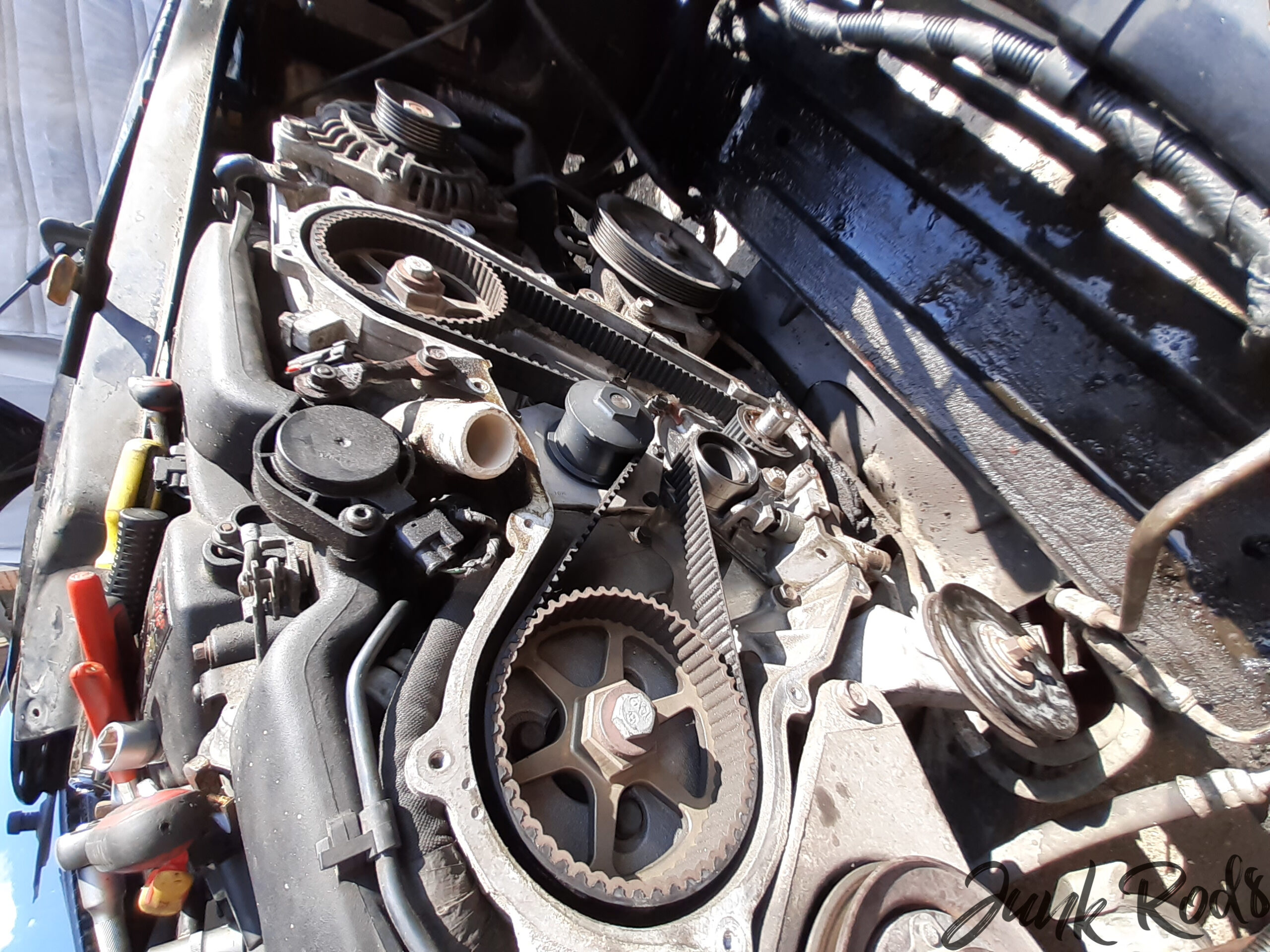 Nečekaně – ale překvapení to bylo příjemné – zbytek práce už byla skoro formalita. Rozvodovou sadu jsem měl doma, tak jsme ji raz dva vyměnili včetně vodní pumpy a řemenice na napínací kladce. Rozvody za chviličku hotové i s cigárkem v ruce. Nastartovat motor pro kontrolu, buď a nebo. Vše funguje, vodní pumpa neteče. Paráda. 😎