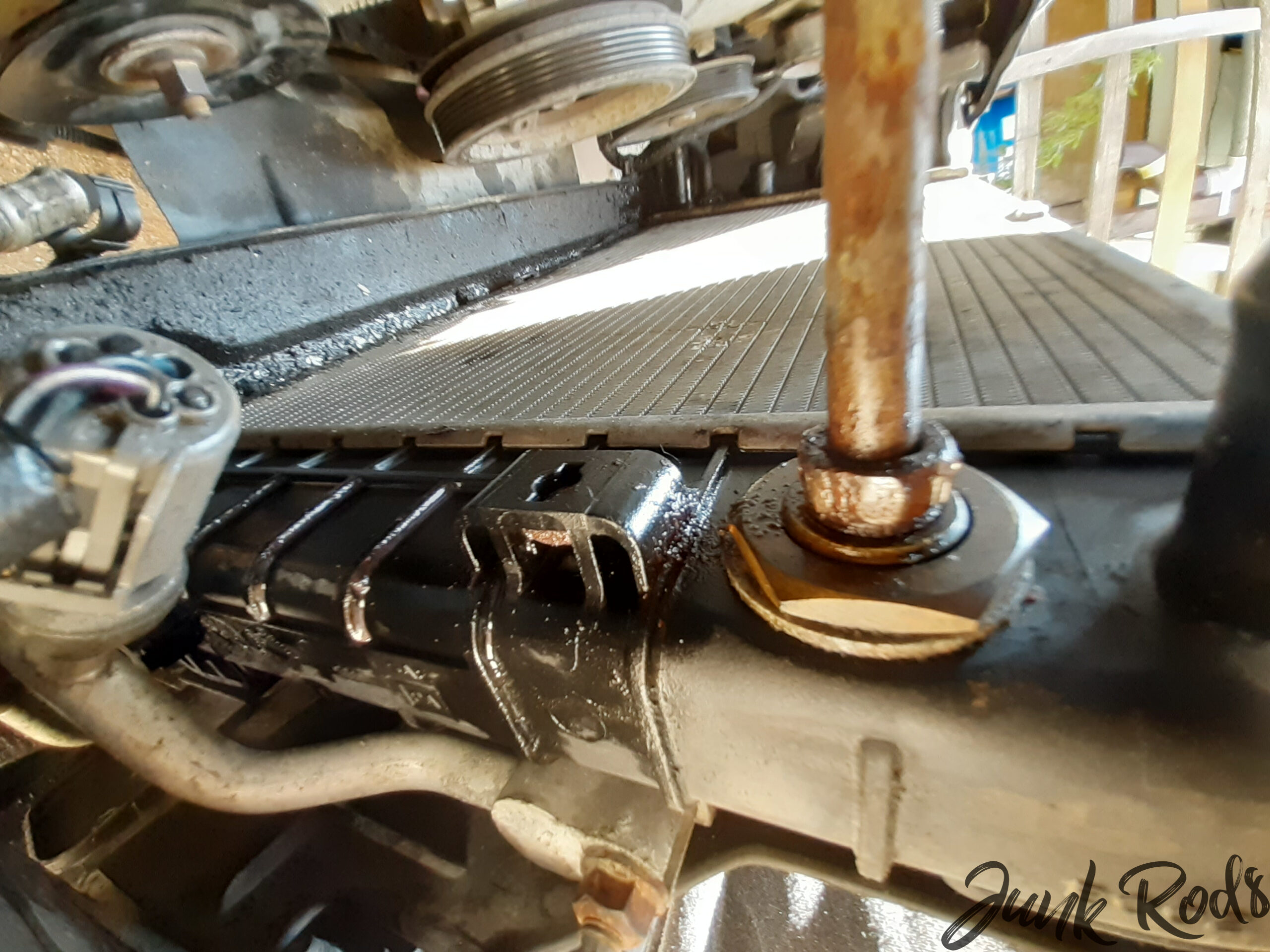 Postup je jasný – demontovat příčku nad chladičem, rozpojit hadice, vytáhnout větráky… Tady se zastavme. Chvilku pozornosti si zaslouží trubky motorového oleje a holendry na jejich koncích, které za žádnou cenu nechtěly povolit ze závitu na výměníku aniž bychom protočili trubky. Co teď? V mezičase dorazil i Gustaw, a tak s Viktorem sedli do auta a vydali se znova do Kelly, dokud bylo otevřeno, pro pertlovací sadu. Nějaké trubky tu mám, poradíme si, přinejhorším se uzavře okruh oleje bez chladiče.