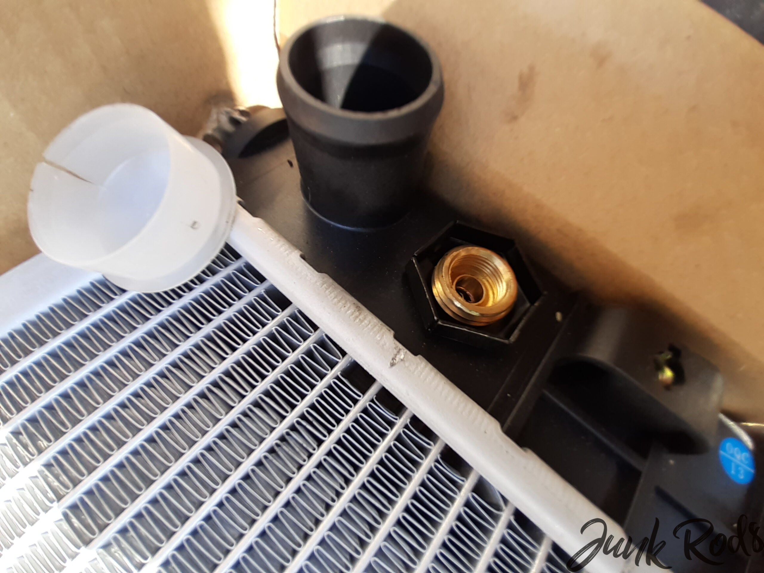 A teď už to jen nastrojit zpátky. Nový chladič šup tam, přehodili jsme ale spodní silentbloky ze starého kvůli lepší fixaci. Zapojit trubky, namontovat větrák. OK, a teď nové světlo a slícovat. Rozhodli jsme se ale ještě před tím rovnou zalít motor a chladič chladící kapalinou (růžová G12 koncentrát 50:50 s destilovanou vodou) a odvzdušnit. Je to sice jednoduchá věc, ale trvá to u těchto motorů nějaké 2 hodiny. Nastartovat, pustit topení, postupně odvzdušňovat, nechat otevřít termostat a sepnout větráky, vypnout motor, dolít fridex a tak furt dokola, dokud z odvzdušňováku neteče voda jak z kohoutku, bez bublin a nezpěněná. Prostě 2 hodiny, pokud má to být pořádně.