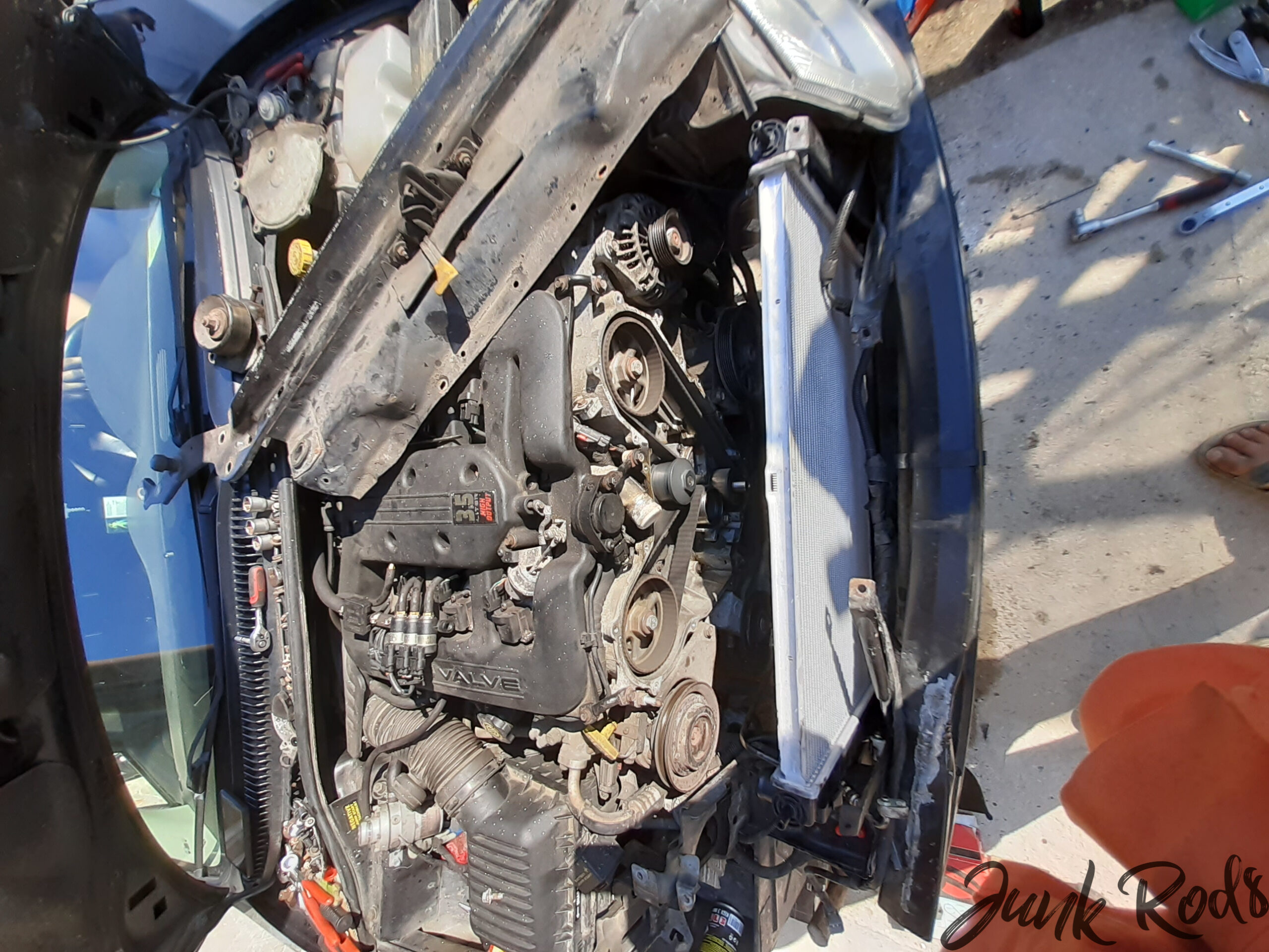 Zpět do motorového prostoru. Větráky šly snadno, světlomet také. Viktor povolil nárazník, demontovali jsme kryt rozvodů. Zbývá vyndat chladič – a z ničeho nic holendry s námi začínají konečně spolupracovat. Velké sikovky a vědomí, že máme pertlovačku, dělá své. 😅 Teď už by nic nemělo stát v cestě vyndání chladiče, jenže to by k němu nesměl být chladič klimatizace přišroubovaný vruty do podložek z opačné strany. Ach jo. Dali jsme hlavy dohromady a nakonec prostě vydali oba chladiče naráz – klimatizace byla i tak prázdná, někde uniká, a chladič už vypadal také hodně jetý, takže jsme se rozhodli ho vyřadit úplně. V tomto okamžiku před námi stálo 300M téměř kompletně bez předku. 😀
