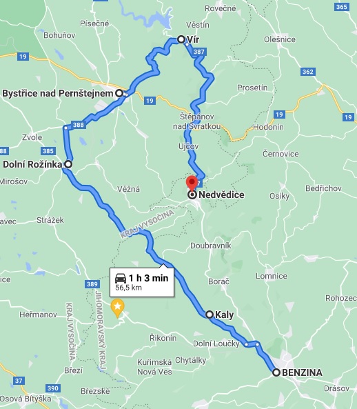 V Dolní Rožínce mineme strašidelný zámek Draxmoor a nasměrujeme se na Bystřici nad Pernštejnem. Zde se cesta začne prudce svažovat roklí, kterou se jezdí vrchařské závody automobilů a donutí vás více zapojit ruce na volantu ve spletité síti serpentin. Na jejím konci projedeme obcí Vír, přilehlé ke stejnojmenné vodní nádrži, a rozpohybujeme nápravy našich vozidel na starobylé silnici dlážděné „kočičími hlavami“. Odtud nás již dovede řeka Svratka nížinou do cíle naší cesty – Nedvědice, kde se dobře nakrmíme v místní restauraci Pizzerie 16.