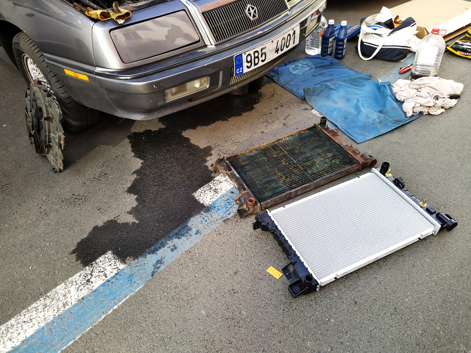 Ihned tedy objednávám chladič, za týden přišel a já se pustil do výměny. Na ulici před domem, však jsem takhle už měnil kdeco. Zrovna bylo celkem hezky, takže jsem ani moc nenadával na počasí, auto nebylo třeba zvedat, díky poměrně velkému motorovému prostoru barona tu je na všechno dost místa.